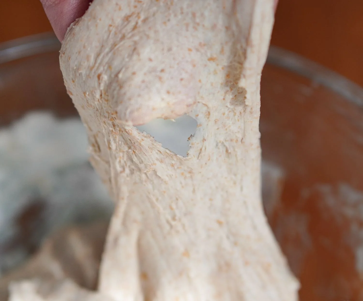 When you want to check if your gluten is developed, you can perform a windowpane test. You can see me perform a windowpane test here or look at the pictures on the right. Stretch out a bit of dough, and check if you can see through it. If you can stretch the dough far enough to see through it, then your gluten is well developed. However, if your dough breaks, you may want to perform another stretch and fold.